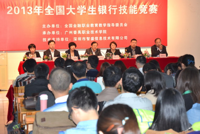 2013年11月24日,由全國金融職業(yè)教育教學(xué)指導(dǎo)委員會(huì)主辦、廣州番禺職業(yè)技術(shù)學(xué)院承辦、深圳智盛信息技術(shù)股份有限公司支持的“2013年全國大學(xué)生銀行技能競賽”在廣州番禺職業(yè)技術(shù)學(xué)院舉行。中國人民銀行中國金融培訓(xùn)中心主任、全國金融行業(yè)指導(dǎo)委員會(huì)常務(wù)副主任委員萬存知,中國人民銀行中國金融培訓(xùn)中心副主任、全國金融行指委常務(wù)秘書長馬玉蘭,廣州番禺職業(yè)技術(shù)學(xué)院副校長王曉敏,智盛公司總經(jīng)理彭家源等領(lǐng)導(dǎo)蒞臨比賽現(xiàn)場。來自全國84所高職院校的252名選手和領(lǐng)隊(duì)、指導(dǎo)老師以及相關(guān)單位和觀摩單位代表共700余人參加活動(dòng)。