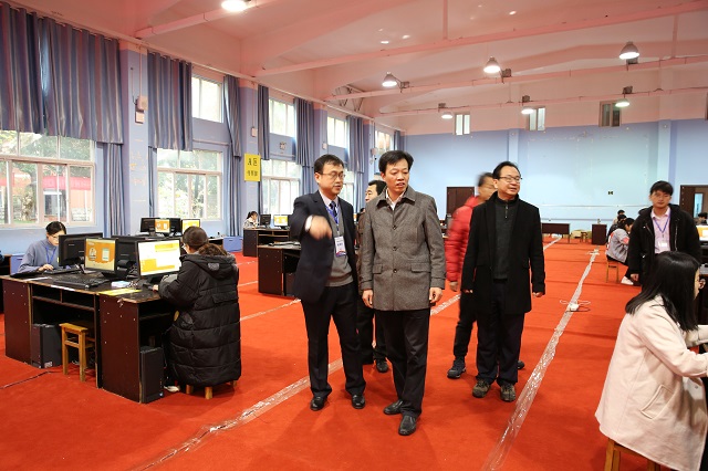 江西財(cái)經(jīng)職業(yè)學(xué)院黨委副書記、常務(wù)副院長何先應(yīng)教授親臨比賽現(xiàn)場指導(dǎo)。(左邊是全國職業(yè)院校銀行業(yè)務(wù)綜合技能競賽賽項(xiàng)裁判鄭興教授,在本次省賽中擔(dān)任裁判長。右邊是財(cái)稅金融學(xué)院樊院長)