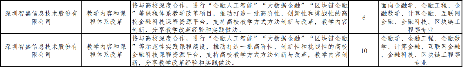 教學(xué)內(nèi)容和課程體系改革項(xiàng)目要圍繞目前產(chǎn)業(yè)的熱點(diǎn)技術(shù)領(lǐng)域,包括區(qū)塊鏈金融、金融大數(shù)據(jù)、金融人工智能等,支持高校在這些領(lǐng)域的課程建設(shè)和教學(xué)改革工作,建成一批高質(zhì)量、可共享的課程教案和教學(xué)改革方案。這些建設(shè)成果將向社會(huì)開(kāi)放,任何高校都可以參考借鑒用于教學(xué)和人才培養(yǎng)目的。