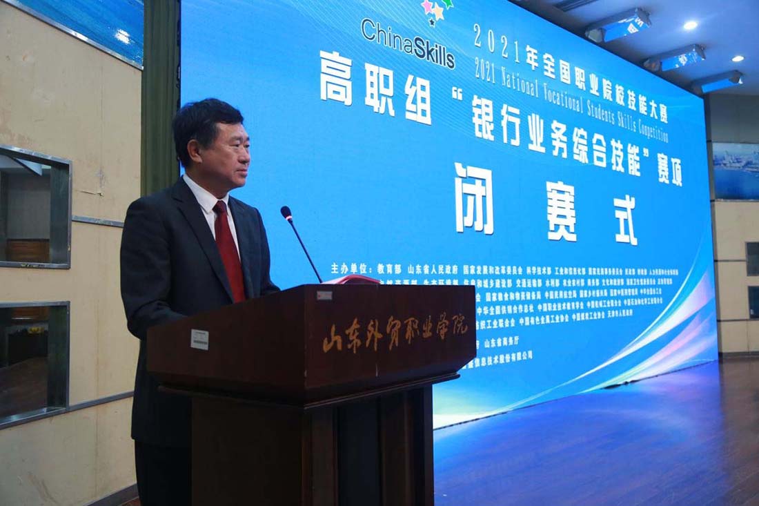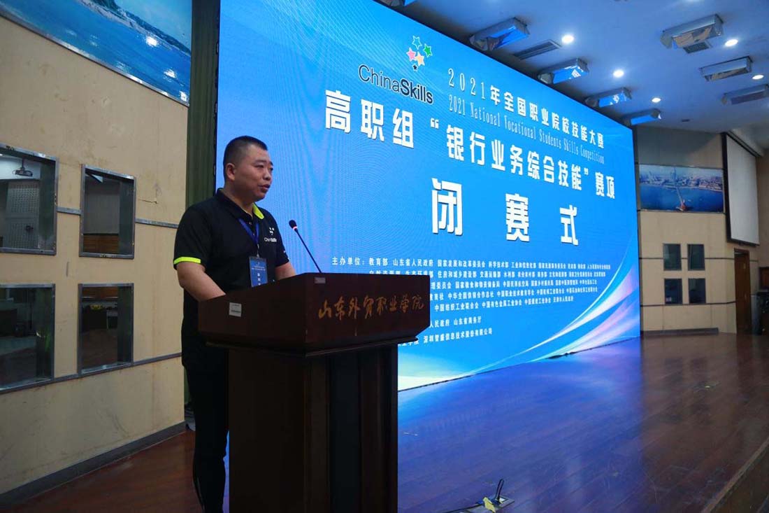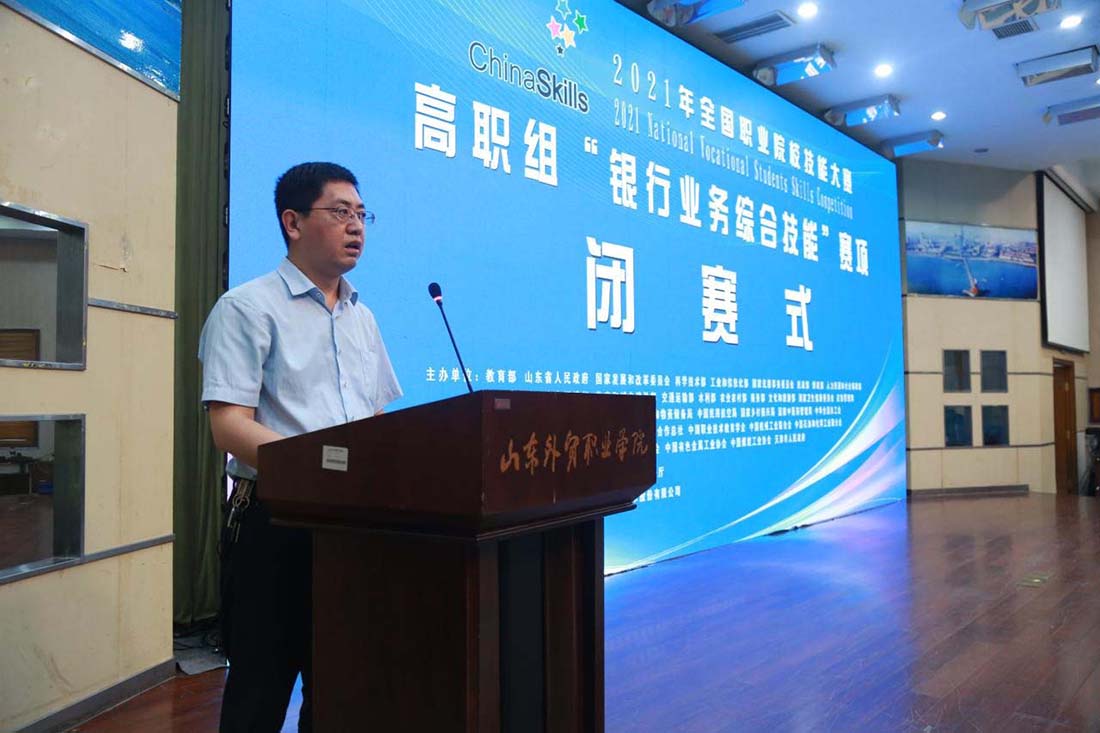 閉幕式上,大賽專家組長、江蘇省徐州財經(jīng)高等職業(yè)技術(shù)學(xué)校副校長張勇對本次比賽的四個項目進(jìn)行了點評。青島市教育工委委員、教育局黨組成員、總督學(xué)李岷,山東省教育廳職業(yè)教育處副處長李海濤,青島市地方金融監(jiān)督管理局一級調(diào)研員鞠京福,省商務(wù)廳業(yè)務(wù)聯(lián)絡(luò)辦公室主任姜寶臣,青島農(nóng)商銀行行長劉宗波,全國金融職業(yè)教育教學(xué)指導(dǎo)委員會副秘書長成銓,泉州輕工職業(yè)學(xué)院商學(xué)院院長顏建立等出席了閉幕式,山東外貿(mào)職業(yè)學(xué)院院長刁建東主持閉幕儀式。