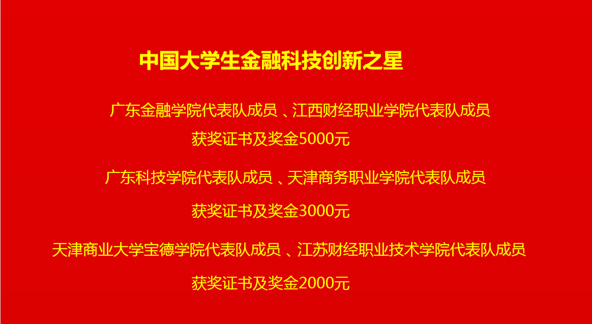 今年與往屆不同的是特增加了企業(yè)招聘宣講活動,針對金融科技人才緊缺結合人才培養(yǎng)要求,促進教學改革,為本次優(yōu)秀人才提供實習就業(yè)機會,同時也為各大院校與企業(yè)零距離提供交流機會,讓更多院校了解企業(yè)對復合型人才的要求,助力打通人才培養(yǎng)與人才輸送通道。最后讓我們一起來看下獲獎名單吧~